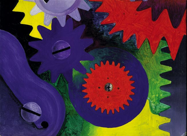 L'ISPIRAZIONE ARTISTICA: trae le sue origini nel primo novecento fra simbolismo, futurismo e dadaismo. In particolare il futurismo, al tempo della sua nascita, era veramente innovativo, talora non privo di provocazioni e teso a superare l'arte "classica" nell'esaltazione della novità, della modernità e del progresso scientifico e tecnologico che, come sembrava allora, era destinato a liberare l'uomo dalla schiavitù del lavoro manuale e dall'imperfezione del lavoro artigianale. Tuttavia oggi, ad un secolo di distanza, l'uomo si trova ancora costretto, prigioniero di un progresso che avanza in ogni direzione: sono cresciute le possibilità di movimento, comunicazione e apprendimento, ma anche le difficoltà di adattamento ai nuovi mezzi e, soprattutto, alle nuove concezioni della vita che ogni innovazione tecnologica porta con sé. L'evoluzione del progresso non ha ancora risolto le questioni di base sulle quali l'uomo si interroga da sempre. La modernità è solo un'impressione, a volte sovrapponibile alla moda. La scelta di utilizzare lo stile espressivo di inizio novecento è stata attuata per dare continuità al discorso iniziato allora, per sottolineare il fatto che il progresso tecnologico, allora glorificato, non ha esattamente portato solo benefici all'umanità, ma anche nuovi malesseri e nuovi dubbi esistenziali. La forma grafica scelta per la rappresentazione è l'ingranaggio, eletto a simbolo della "meccanicità" massima. A questo proposito vedasi "Machine tournez vite" di Francis Picabia (1917). |